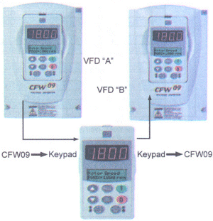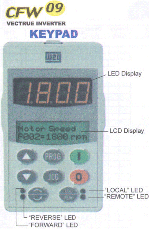 INTELLIGENT KEYPAD Intelligent operator interface with double display, LED (7 segment) and LCD (2 lines with 16 characters), providing optimum distant viewing along with a detailed description of all parameters and messages.SELECTABLE LANGUAGE The language of the LCD display messages can be selected by the operator. English, Spanish and Portuguese are available.ORIENTED START-UP The CFWO9 “Oriented Start-up” feature was specially created to facilitate and expedite the start-up procedure. At the first power-up or after a reset to factory default parameters, an automatic programming routine guides the operator through a sequence of steps for the introduction of the minimum parameters necessary for a perfect adaptation between drive and motor.COPY FUNCTION This intelligent keypad also incorporates a “Copy Function”, which allows copying parameters from one drive to others, providing easy and reliable programming repeatability for duplicate applications. Keypad can store two complete sets of user parameters. |